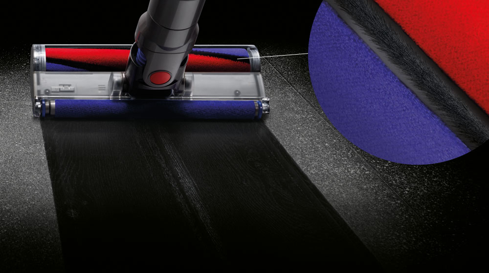 Four rows of soft anti-static carbon fibre filaments help to dissipate any static charge holding fine dust to the floor surface, allowing it to be sucked into the vacuum. Unlike with conventional brush bars, the roller has constant contact with the floor. There’s no gap, so powerful suction is sealed in to draw up fine dust from crevices.