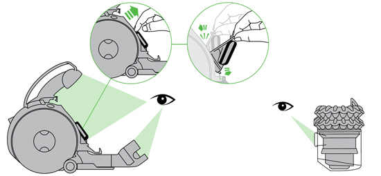 • To remove the cyclone and clear bin, push the release button to the side of the carrying handle, as shown. The carrying handle will be released. Remove the cyclone and clear bin unit.