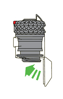 - Place the clear bin and cyclone into position on the front of the main body. The recess in the base of the clear bin must fit onto the lug on the locator bracket.