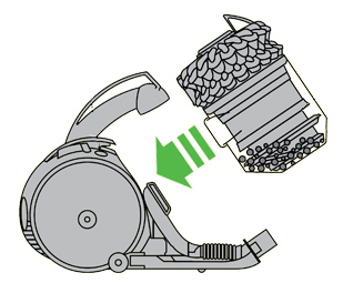 - To remove the cyclone and clear bin, push the release button to the side of the carrying handle, as shown. The carrying handle will be released. Remove the cyclone and clear bin unit.