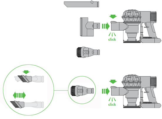 - Slide the accessories into the inlet pipe on the bin assembly until they 'click' into position.