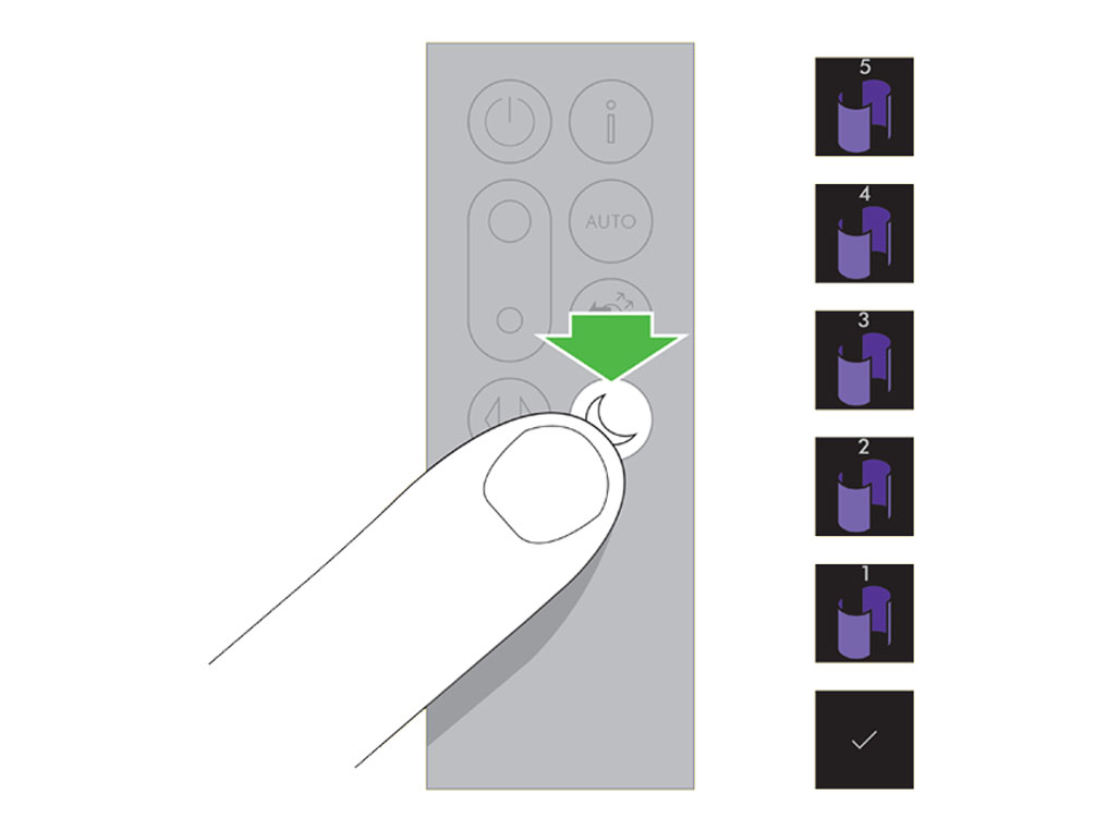 Press and hold the Night mode button on the remote control. The display on the appliance will countdown from five, finishing with the default screen. The glass HEPA filter level will be reset and the appliance is ready to use.