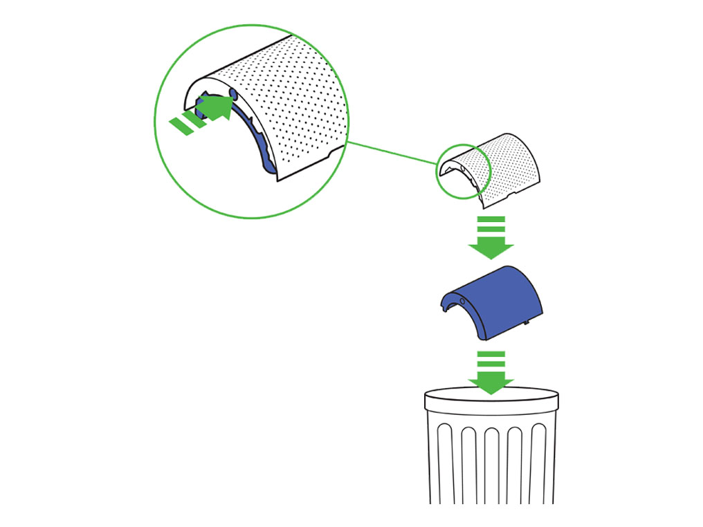 Empty the glass HEPA filters directly into the bin by pushing in both the purple tabs on the shrouds.Dispose of used filter units in accordance with local regulations.