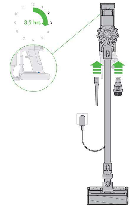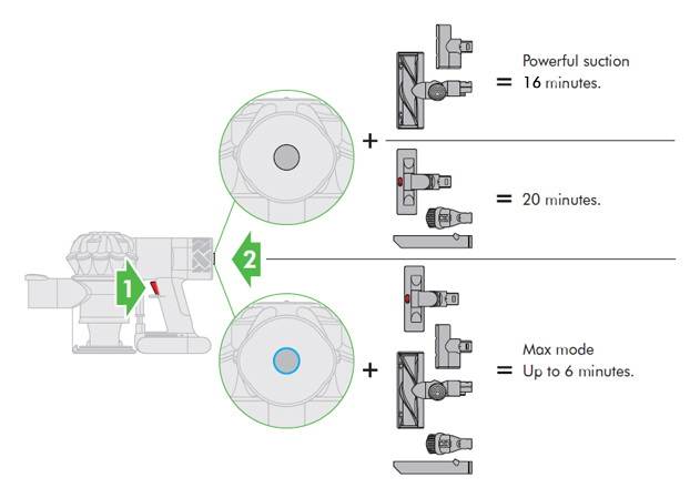 Your Dyson handheld is designed to give constant suction. When fully charged your Dyson handheld will give between 6 to 20 minutes of powerful constant suction depending on the power mode and tool selected.