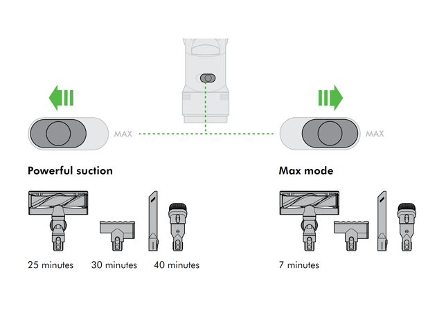 Your Dyson handheld is designed to give constant suction. When fully charged your Dyson handheld will give between 7 to 40 minutes of powerful constant suction depending on the power mode and tool selected.